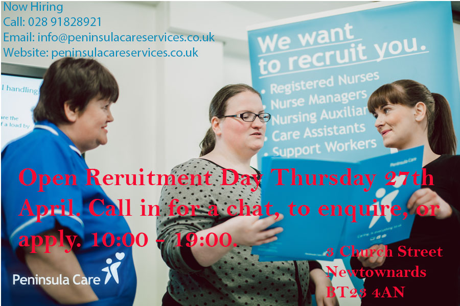 We are proud to announce our first Peninsula Care Open Recruitment Day! It will be held from 10:00-19:00 on Thursday 23rd April. If you are interested in a new career in Care, or a change of scenery, please feel free to call in to our Newtownards office at 3 Church Street, Newtownards, at any point during the day.